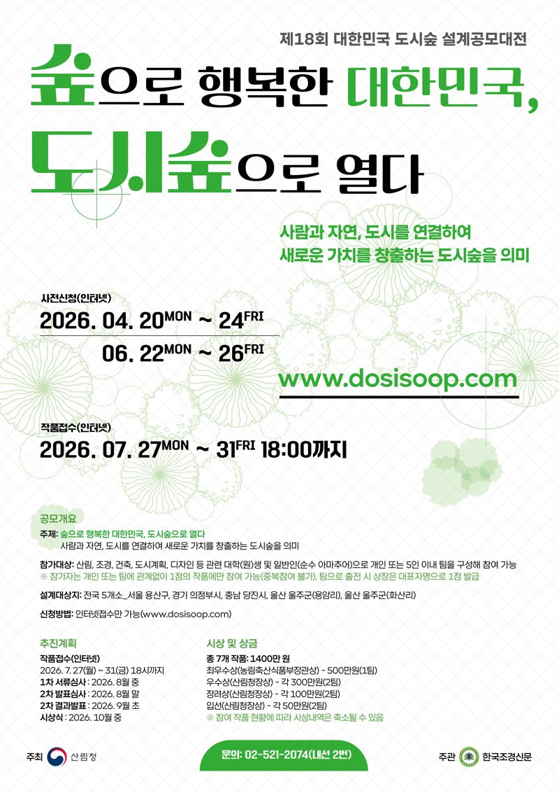 이번 공모대전은 ‘숲으로 행복한 대한민국, 도시숲으로 열다’라는 주제로 사람과 자연, 도시를 연결해 새로운 가치를 창출하는 도시숲이라는 의미를 담았으며, 창의적이고 실현가능한 설계 아이디어를 발굴하기 위해 마련됐다.
