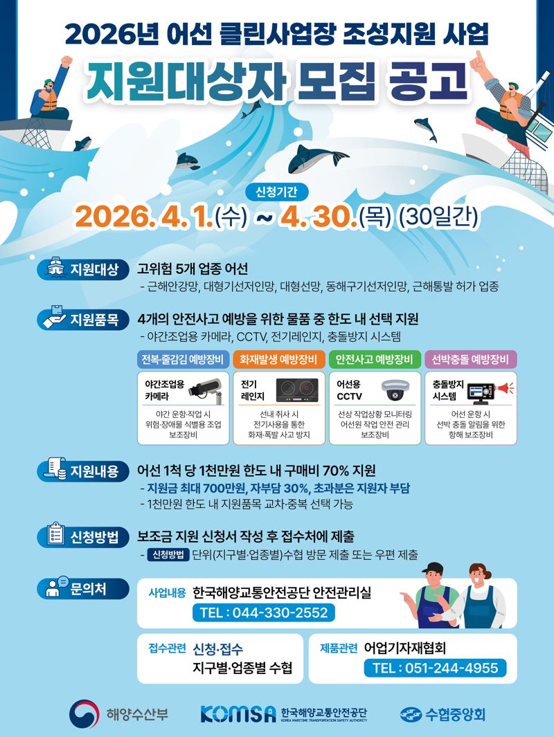 이 사업은 안전사고 발생 위험이 높은 노후 연근해 어선을 대상으로 노후·위해 시설과 장비의 교체 또는 안전장비 설치 비용을 지원하는 것이다.