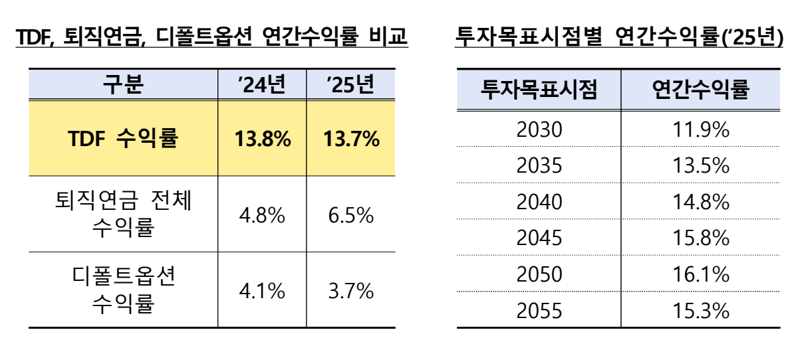 수익률 측면에서도 독보적이다. 지난해 TDF 전체 수익률은 13.7%를 기록해 퇴직연금 전체 수익률(6.5%, 잠정치)의 2배 수준이다. 원리금 보장 상품 위주인 디폴트옵션 수익률(3.7%)과 비교하면 약 4배에 달하는 성과를 냈다.