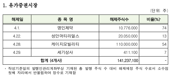 코스피에서는 명인제약, 성안머티리얼스, 케이지모빌리티, 세기상사 등 4개사 1억4124만주의 등록이 풀린다. 코스닥에서는 큐라티스, 아이엠비디엑스, 아이로보틱스 등 46개사 2억2176만주가 해제된다.