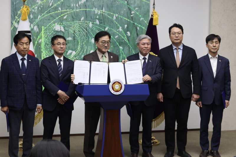 우원식 국회의장은 31일 국회에서 '초당적 개헌 추진을 위한 제정당 원내대표 기자회견'을 열고 "국회는 압도적 다수의 국민 뜻과 제정당의 의지를 모아 오늘(31일)부터 헌법 개정안 발의 절차에 착수하겠다"고 밝혔다. 한병도 더불어민주당·서왕진 조국혁신당·윤종오 진보당·천하람 개혁신당 원내대표와 한창민 사회민주당·용혜인 기본소득당 대표가 서명했다.