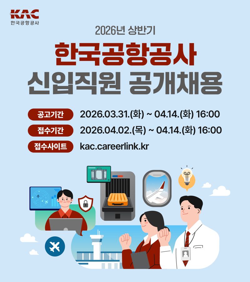 한국공항공사는 31일, 이날부터 정부 청년 일자리 창출 노력에 동참하기 위해 2026년도 상반기 신입사원을 채용한다고 밝혔다.