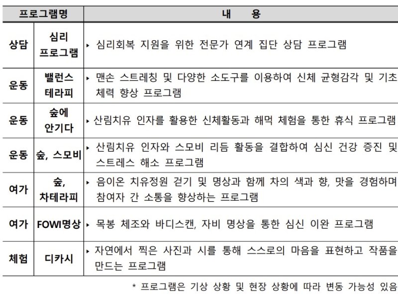 올해 프로그램은 3월부터 11월까지 매달 전국 산림복지시설에서 진행한다. 대전 국립대청숲체원, 경북 영주국유림관리소, 전북 진안치유의숲, 강원 횡성·춘천 등 지역 거점별로 참여할 수 있다.
