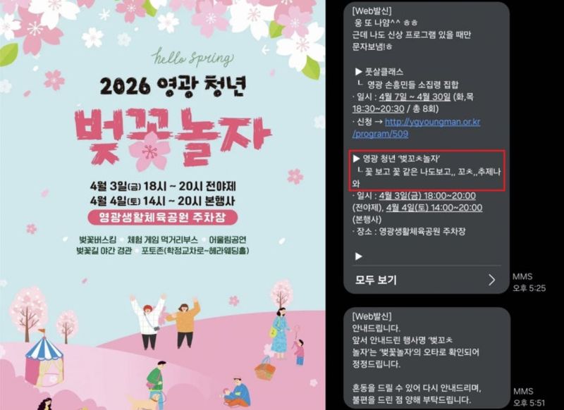 해당 메시지에는 다음 달 3~4일 영광생활체육공원 주차장에서 열리는 벚꽃축제 '벚꽃놀자'와 7일부터 진행되는 '풋살 클래스' 일정 등이 담겼다.