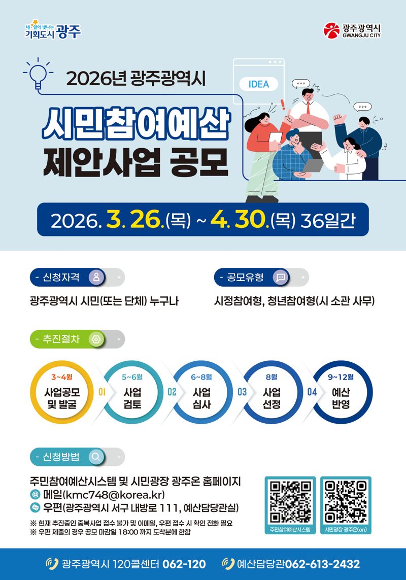 【파이낸셜뉴스 광주=황태종 기자】광주광역시는 2027년도 예산 과정에 시민참여를 보장하기 위해 오는 30일까지 '시민참여예산 제안 사업'을 공모한다고 밝혔다.
