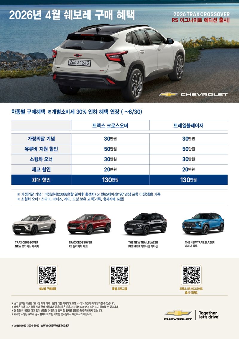 쉐보레는 가정의 달을 앞두고 트랙스 크로스오버와 트레일블레이저 구매 고객에게 30만 원의 특별 할인 혜택을 제공한다. 해당 혜택은 미성년자 또는 만 65세 이상 가족을 둔 고객에게 적용되며, 스파크 등 소형차 보유 고객(가족·형제자매 포함)과 5년 이상 노후 경유차를 보유한 고객도 대상이다.