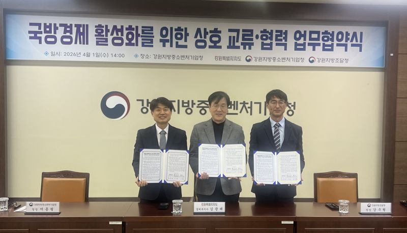 강원자치도는 1일 오후 강원중소벤처기업청 중회의실에서 강원중소벤처기업청, 강원조달청과 함께 지역내 중소기업의 군납시장 진출 지원과 국방경제 활성화를 위한 업무협약을 체결했다.