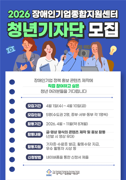 모집 규모는 수도권 2명과 중부·서부·동부권 각 1명씩 총 5명이다. 지원 자격은 장애인기업, 창업, 콘텐츠 제작 및 홍보 분야에 관심이 있고 평일 행사 참석이 가능한 만 19세 이상 34세 이하 청년이다.