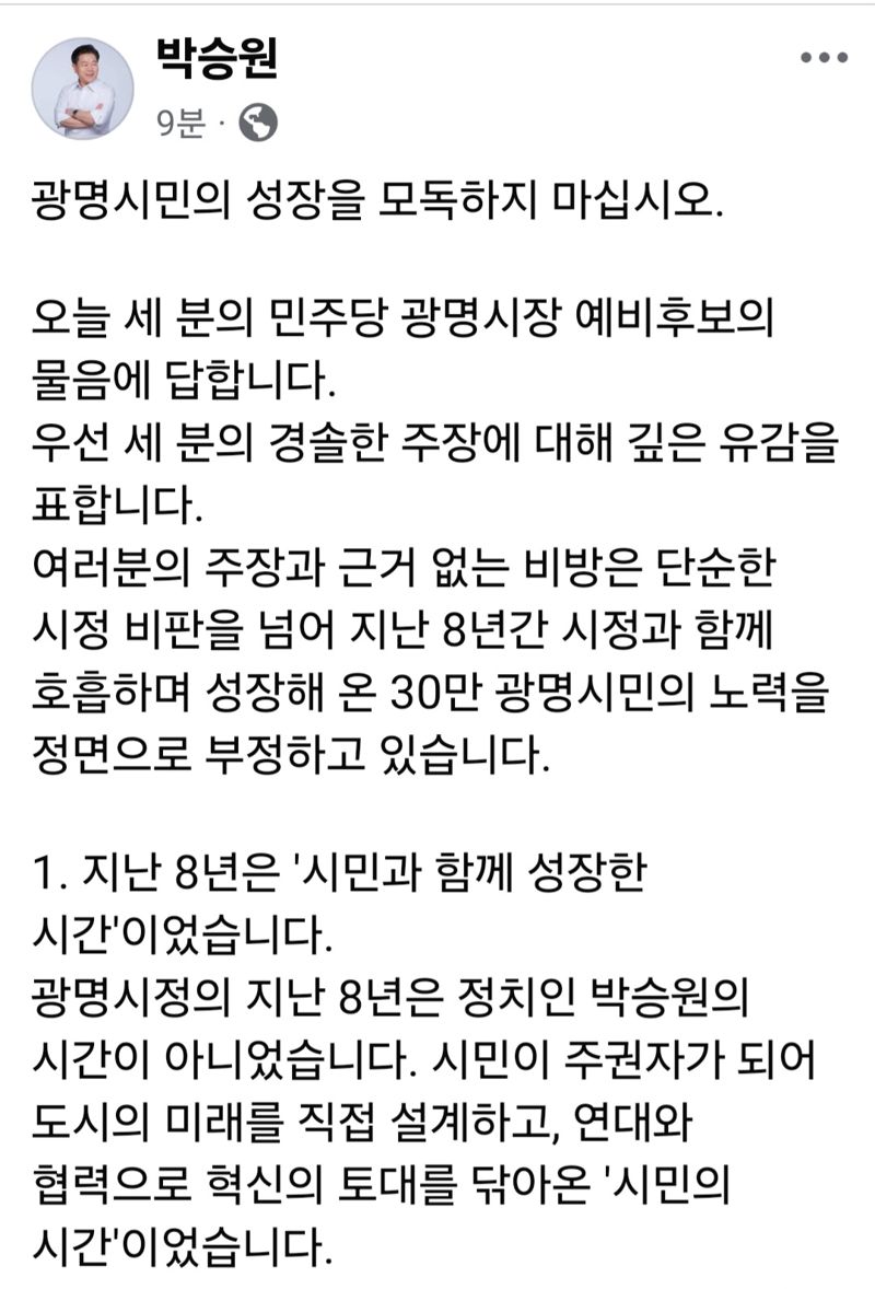 이에 대해 박 시장은 이날 자신의 페이스북을 통해 "세 분 예비후보의 경솔한 주장과 근거 없는 비방은 단순한 시정 비판을 넘어 지난 8년간 시정과 함께 호흡해 온 시민들의 노력을 정면으로 부정하는 것"이라며 이같이 밝혔다.