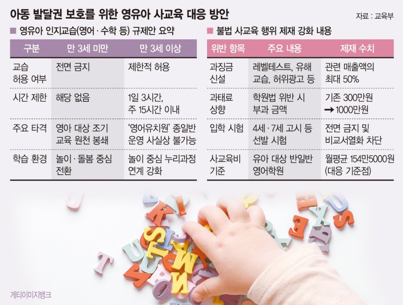 정부가 이처럼 이례적으로 강력한 규제책을 꺼내 든 배경에는 기형적으로 비대해진 영유아 사교육 시장이 있다. 교육부 조사 결과, 유아 대상 반일반 영어학원의 월평균 사교육비는 154만5000원에 달한다.