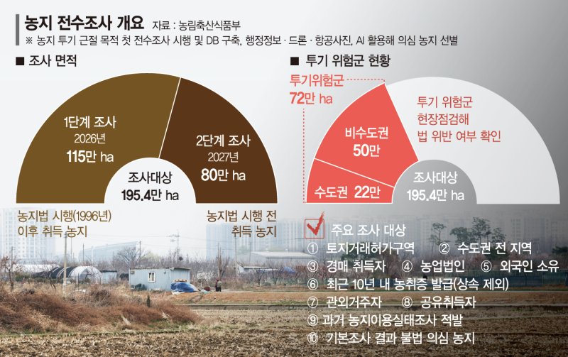 농지대장 기준 전체 농지는 약 195만4000㏊(1447만 필지)다. 정부는 1단계로 1996년 이후 취득 농지 115만㏊를 올해 조사하고, 2단계로 내년에는 1996년 이전 취득 농지 80만㏊를 조사할 계획이다. 조사 실효성을 높이기 위해 5000여명의 조사 인력을 확보하고 인공위성과 드론 등 장비도 투입될 예정이다.
