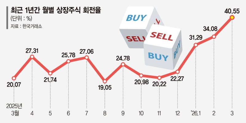 1일 한국거래소에 따르면 올해 3월 상장주식 회전율은 40.55%이다. 이는 1월(31.29%), 2월(34.08%)에 이어 가파른 증가세를 탄 수치다.