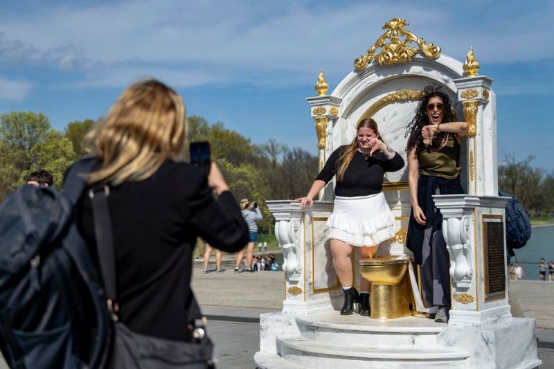 1일 워싱턴포스트(WP) 등 외신에 따르면 관광객들이 많이 찾는 워싱턴DC 내셔널몰에 황금색으로 칠한 변기 조형물이 설치됐다.