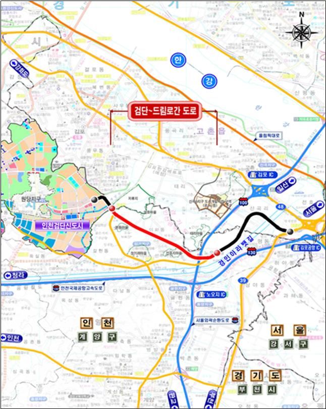 이번 도로 개통으로 검단지구 유현사거리에서 계양구 드림로까지 주행거리는 1.2㎞ 감소(5.1㎞→3.9㎞) 하고 이동시간은 10분 단축(18분→8분) 될 것으로 예상된다.