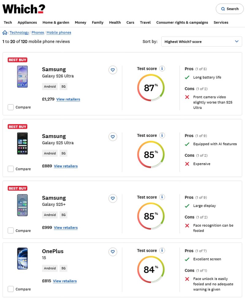 위치는 스마트폰 랭킹에 갤럭시 S26 울트라를 총점 87점의 1위로 발표하며 "모든 실험실 테스트에서 뛰어난 성능을 보여줬다"고 평가했다.