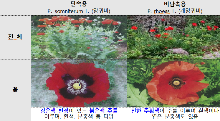 양귀비는 마약용과 관상용 양귀비로 나뉜다. 마약성은 양귀비 즙을 가공해 모르핀과 헤로인, 코데인 등 마약으로 악용될 수 있다. 관상용 꽃(개)양귀비는 마약 성분이 없다. 다만 생김새가 비슷해 구분에 주의가 필요하다.