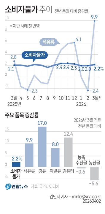 문제는 미국-이란 전쟁으로 촉발된 지정학적 리스크다. 석유류가 9.9% 뛰며 전체 물가를 0.39%p 끌어올렸다. 석유류 물가 상승률은 러시아-우크라이나 전쟁이 발생한 해인 2022년 10월(10.3%) 이후 3년 5개월 만에 가장 높았다. 미국-이란 전쟁으로 인한 국제유가가 배럴 당 110달러를 넘어선 것이 반영됐지만 지난달 1차 석유최고가격제 시행으로 주유소 판매가격을 제한해 상승폭이 완화됐다.
