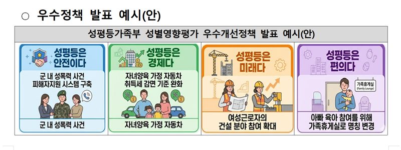 성평등가족부는 3일부터 17일까지 성별영향평가를 통해 개선된 정책 중 국민의 삶을 실질적으로 바꾼 우수 사례를 공유하는 ‘국민투표 이벤트’를 진행한다고 2일 밝혔다.