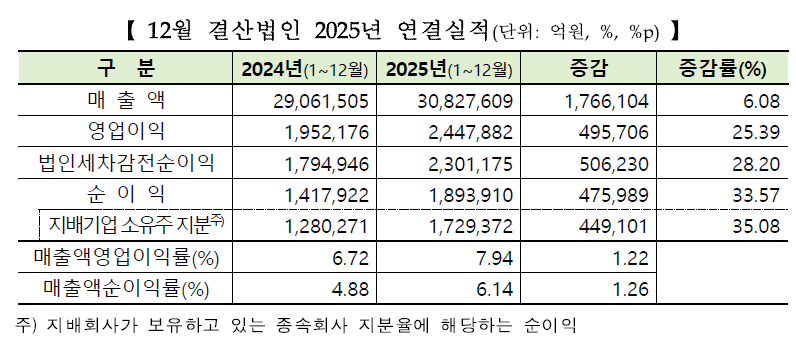매출액과 순이익은 각각 6.08%(176조6104억원), 33.57%(47조5989억원) 급증한 3082조7609억원과 189조3910억원으로 집계됐다.
