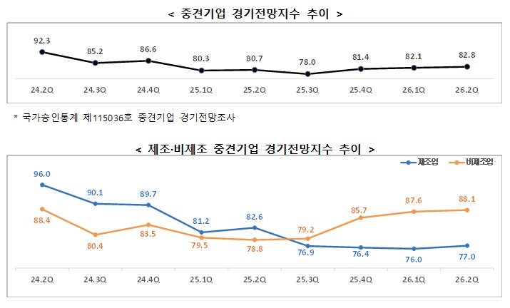 중견기업의 올해 2·4분기 경기전망지수는 전 분기(82.1) 대비 0.7p 상승한 82.8이다.