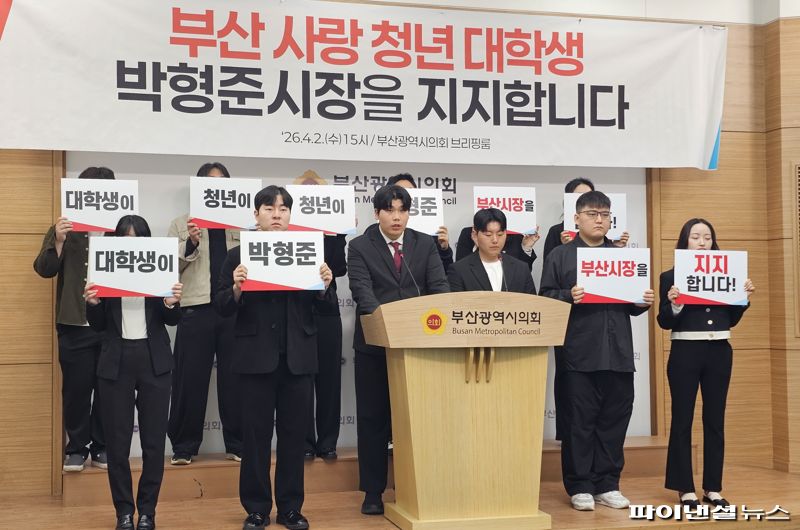 부산사랑청년대학생연대는 2일 부산시의회 브리핑실에서 기자회견을 열고 현역 부산시장인 박 시장의 3선 도전을 지지한다고 밝혔다.