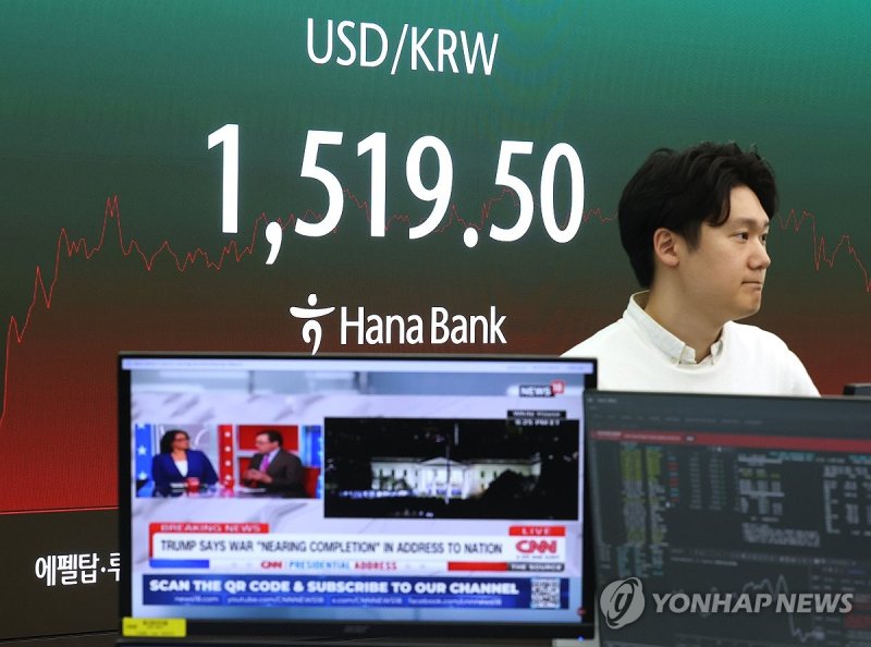 트럼프 대통령이 한국 시간으로 오전 10시에 한 대국민 연설에서 구체적인 종전 구상을 내놓지 않자 급격히 상승폭을 키워 장중 1,524.1원까지 올랐다.