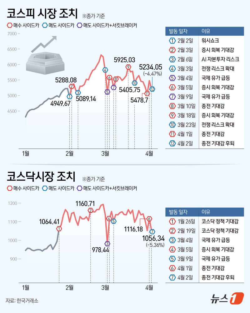 3월 들어서만 양 시장에서 10번의 사이드카가 발동했는데 미국과 이란 전쟁이 시작된 후 종전 기대와 실망이 반복적으로 교차한 영향이 크다. 종정 기대감에 따른 급등과 차익 실현 매물이 반복되며 시장 변동 폭이 확대됐다.