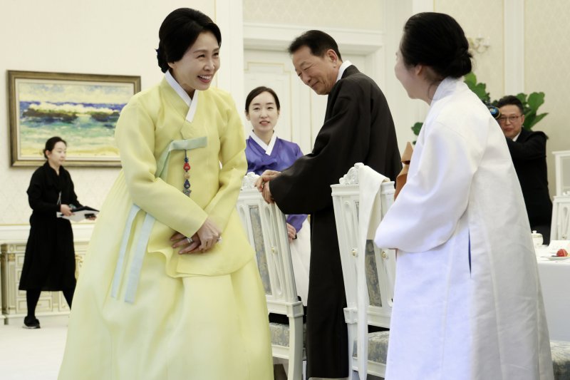 김 여사는 이날 청와대에서 열린 한복생활 유네스코 등재추진단 차담회에서 "전통을 잇는 건 쉬운 일이 아닌 것 같다"며 "보이지 않는 곳에서 오랜 시간 묵묵히 그 길을 걸어와주신 여러분이 계셨기에 한복은 과거의 유물이 아닌 살아 숨 쉬는 오늘날의 문화로 자리 잡게 된 것 같다"고 말했다.