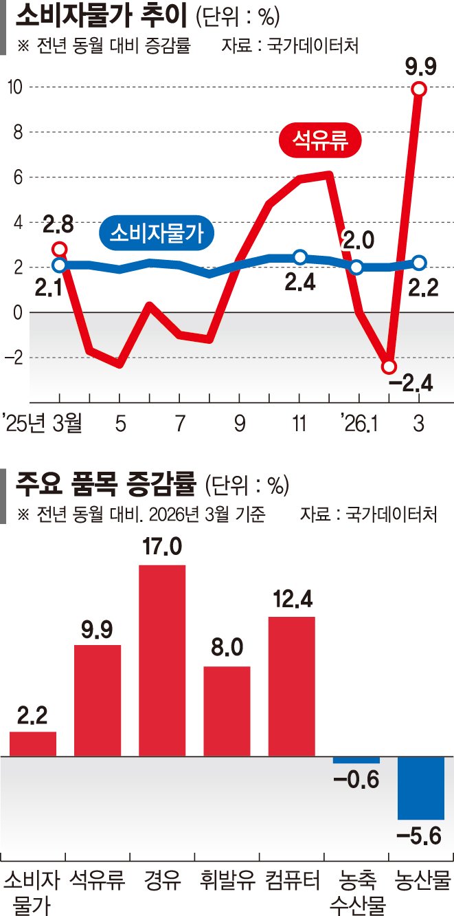 정부는 소비자물가 2.2%면 선방했다고 보고 있다. 이날 이형일 재경부 제1차관은 중동전쟁 물가대응팀 겸 물가관계차관회의를 주재하고 "3월 소비자물가는 중동전쟁 및 국제유가 상승에 따른 석유류 가격 오름세에도 불구하고 농산물가격 하락, 석유 최고가격제 시행 등 영향으로 2.2% 상승했다"며 "다만 국제유가 변동성이 커 상방 압력이 상존하는 만큼 전 부처가 합심해 품목별 가격·수급 안정에 총력을 다해 달라"고 당부했다.