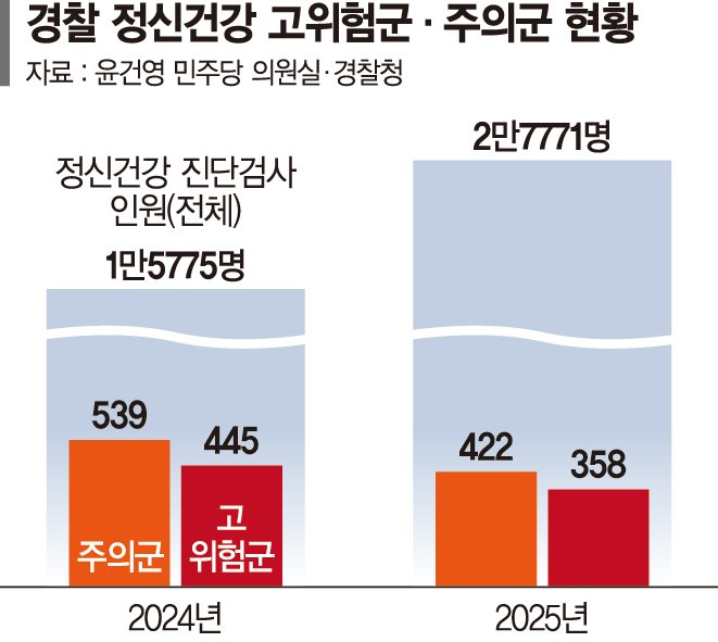 매년 800명이 넘는 경찰관이 정신건강 위험군(트라우마·스트레스로 전문 치료가 시급한 상태)으로 분류되고 있는 것으로 확인됐다. 그러나 예산과 인력 부족으로 제때 치료를 받지 못하는 '관리 사각지대'에 놓여 있다는 지적이 나온다. 전문가들은 현행 경찰 정신건강 관리 체계 전반을 개선해야 한다고 조언했다.