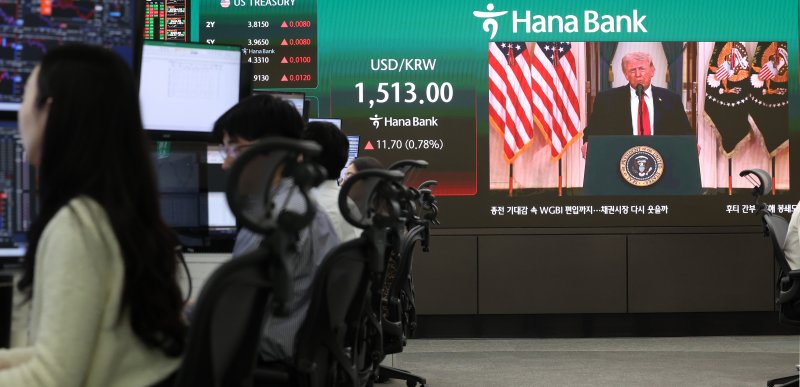 2일 오전 서울 중구 하나은행 딜링룸에 도널드 트럼프 미국 대통령의 대국민 연설 중계방송이 나오고 있다. 2026.04.02. /사진=뉴시스