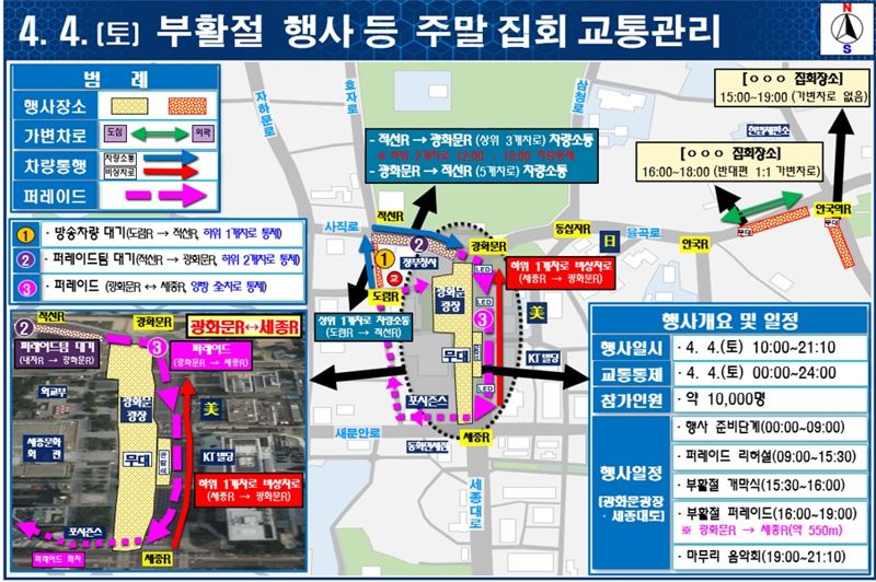 행사가 열리는 광화문 세종대로(광화문교차로∼세종교차로 구간)는 4일 0시부터 자정까지 24시간 동안 전면 통제된다. 경찰은 해당 구간 하위 1개 차로를 긴급차량 비상차로로 운영할 계획이다.