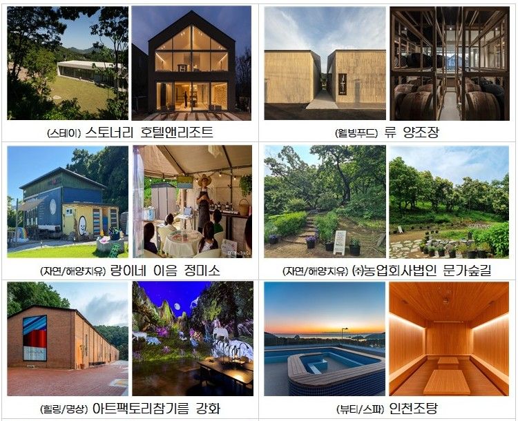 올해 신규로 선정된 관광지는 △스테이(강화 바다와 돌담 사이에서 특산물 차와 함께 사색을 즐기는 ‘스토너리 호텔앤리조트’) △웰빙푸드(마니산 천연 효모로 빚은 순수 증류주 페어링을 즐길 수 있는 ‘류 양조장’, 강화 지역 순무의 현대적 변신과 감각적 쿠킹 클래스가 가능한 ‘핑크김치’) △자연·해양치유(교동도 쌀과 실향민의 서사가 깃든 미식 소풍을 떠나는 ‘랑이네 이음 정미소’, 1만2000평 밤나무숲에서 즐기는 오감 치유 농업의 ‘문가숲길’) △힐링·명상(숲속 산책과 미디어아트가 함께 어우러져 힐링할 수 있는 ‘아트팩토리참기름 강화’) △뷰티·스파(백 년 역사 해수탕의 맥을 잇는 미네랄 스파를 즐길 수 있는 ‘인천조탕’) 등이다.