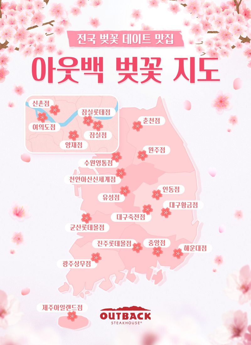 다이닝브랜즈그룹의 캐주얼 다이닝 레스토랑 아웃백 스테이크하우스가 전국 벚꽃 명소 인근의 아웃백 매장을 한눈에 확인할 수 있는 '벚꽃 데이트 맛집 지도'를 공개했다.