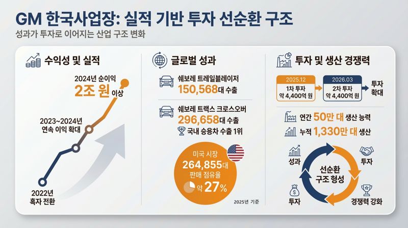 생산 효율 개선과 전략 차종의 글로벌 흥행이 맞물린 결과로, 성과와 연계된 투자 흐름은 GM의 한국사업장 투자에서 가장 뚜렷하게 나타난다. GM이 한국에서 생산하고 있는 쉐보레 트랙스 크로스오버와 트레일블레이저는 글로벌 시장에서 안정적인 수요를 유지하며 핵심 수출 모델로 자리 잡았다.