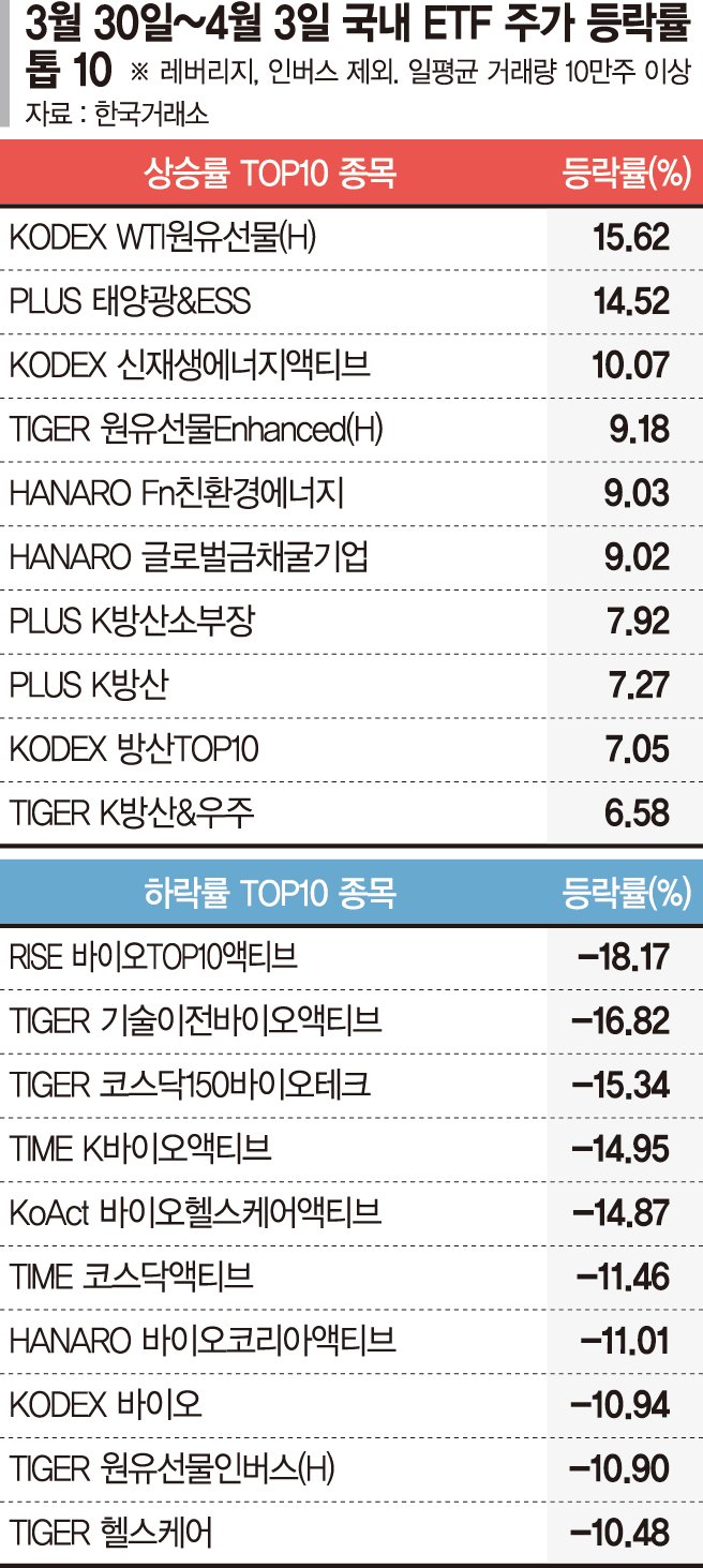 5일 한국거래소에 따르면 지난달 30일부터 이달 3일까지 주간 수익률 1위는 'KODEX WTI원유선물(H)'로 15.62% 상승했다. 레버리지 및 인버스 종목과 일평균 거래량 10만주 미만 종목을 제외한 기준이다.