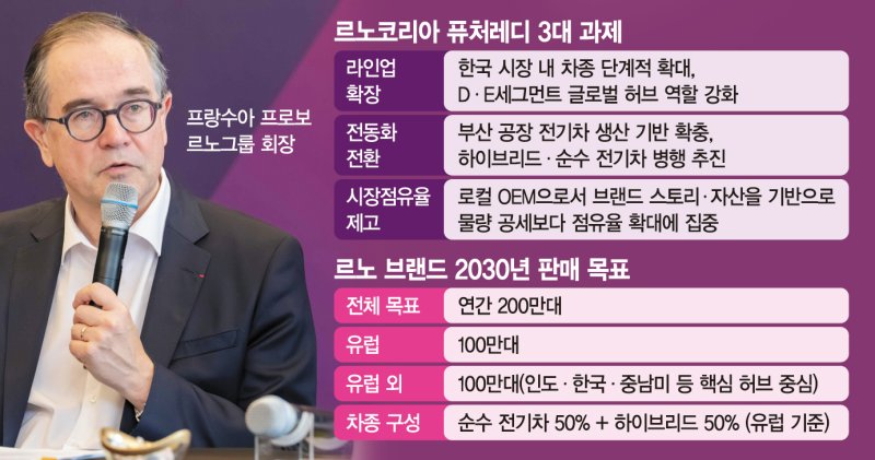 프로보 회장의 이번 방한 핵심 메시지는 퓨처레디 전략 발표 이후 '한국의 역할 강화'다. 프로보 회장은 △한국 내 라인업 단계적 확장 △전동화 전환 집중 △시장 점유율 제고를 르노코리아의 세 가지 핵심 과제로 제시, "퓨처레디 전략에서 르노코리아는 D·E세그먼트의 글로벌 허브 역할을 맡는다"고 강조했다.