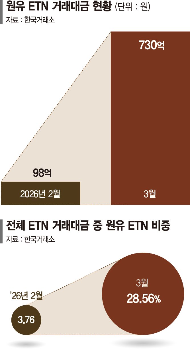 지난달 전체 ETN 거래대금 중 원유 관련 종목이 차지하는 비중은 28.56%로, 전월 3.76% 대비 큰 폭 늘었다.