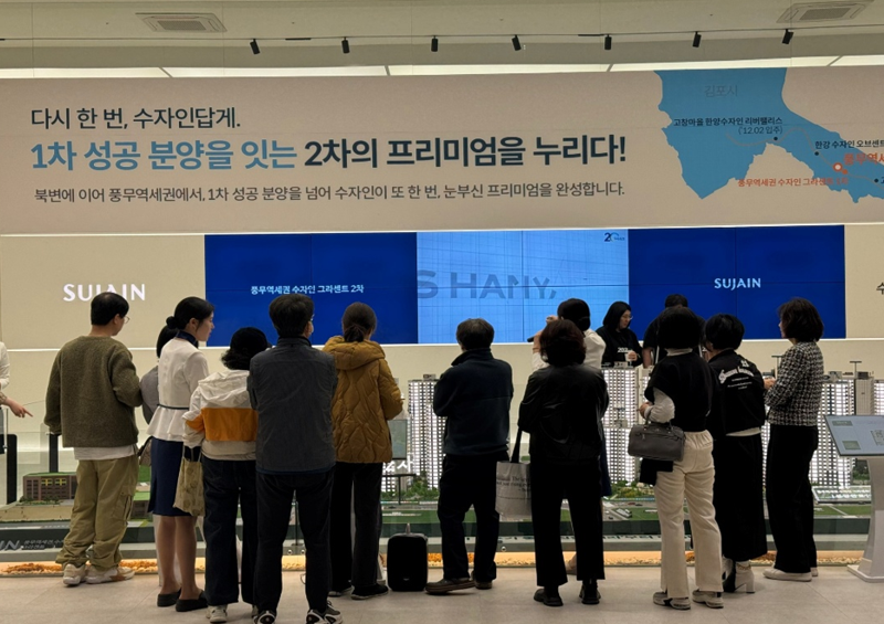 개관 첫날인 금요일부터 이어진 방문 행렬은 주말 내내 이어졌다. 이른 아침부터 입장을 기다리는 대기 줄이 형성됐으며 내부에서는 단지 모형도와 유니트를 꼼꼼히 살펴보는 관람객들로 붐볐다. 상담을 받으려는 실수요자의 기다림도 계속됐다.