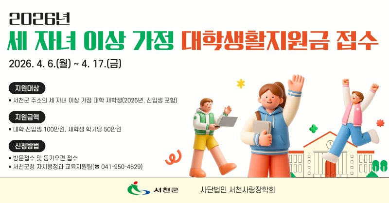 (서천=뉴스1) 김낙희 기자 = 충남 서천군과 서천사랑장학회가 지역 내 세 자녀 이상 가정 대상으로 '대학생 생활지원금' 사업을 추진한다고 6일 밝혔다.