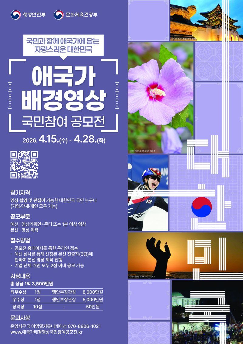 국가 행사와 국민의례에서 사용되는 애국가 배경 영상이 정부 수립 이후 처음으로 국민 참여 방식으로 제작된다. 행정안전부와 문화체육관광부는 정부의 첫 공식 애국가 배경영상 제작에 국민의 창의적 아이디어를 반영하기 위해 ‘애국가 배경영상 국민 참여 공모전’을 개최한다고 6일 밝혔다.