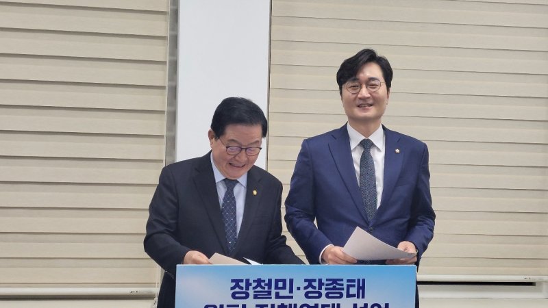 (대전=뉴스1) 박종명 기자 = 더불어민주당 대전시장 후보를 놓고 허태정 후보와 결선투표를 벌이는 장철민 후보가 경선에서 탈락한 장종태 의원과 원팀 정책 연대를 선언했다.