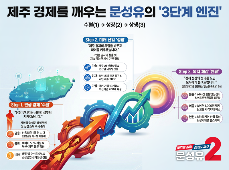 문성유 후보는 제주 경제를 고물가, 고금리, 성장 둔화가 겹친 복합 위기로 규정했다. 단순 지원으로는 버티기 어렵고 실제로 돈이 돌게 하는 구조를 다시 짜야 한다는 진단이다. 문 후보가 내놓은 해법은 수혈, 성장, 상생의 3단계다.