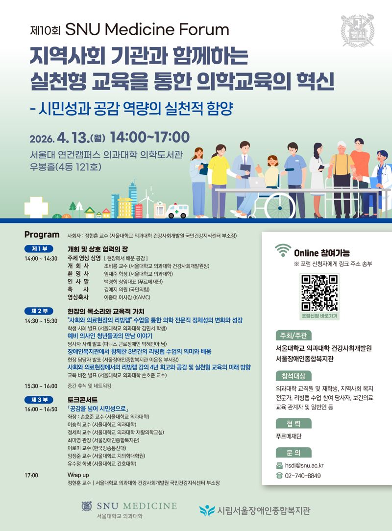 서울대 의과대학 건강사회개발원과 서울장애인종합복지관은 오는 13일 오후 2시 서울대 연건캠퍼스 의학도서관 우봉홀에서 ‘지역사회 기관과 함께하는 실천형 교육을 통한 의학교육의 혁신-시민성과 공감 역량의 실천적 함양’을 주제로 제10회 SNU Medicine Forum을 개최한다고 6일 밝혔다.