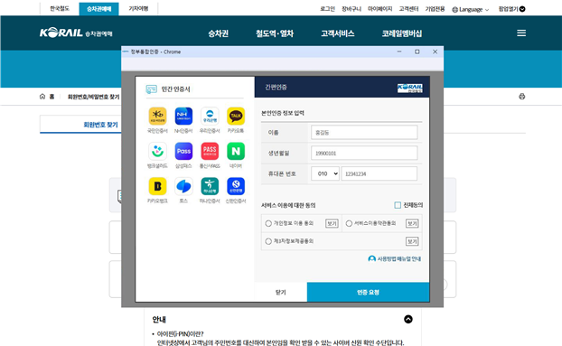 철도회원은 정부통합인증으로 회원정보를 간편하게 찾을 수 있다. 회원번호나 비밀번호를 잊어버렸을 때, 기존 문자인증 방식 대신 네이버, 카카오 등 민간 간편인증으로 본인 확인이 가능해졌다.