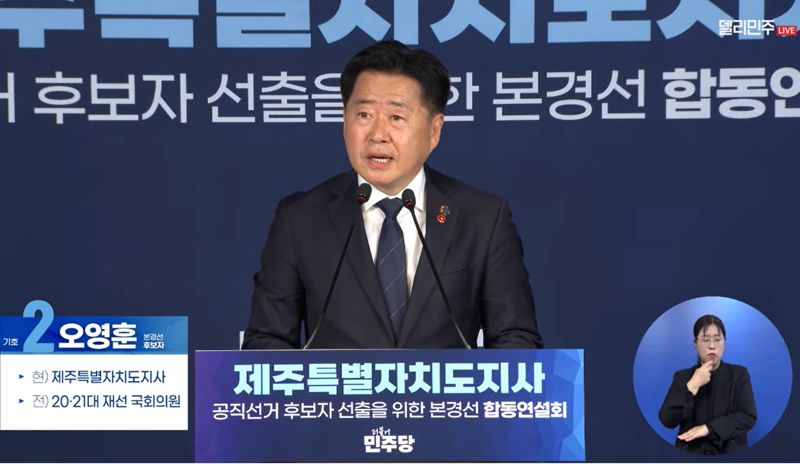 재선에 도전한 오 후보는 이날 더불어민주당 중앙당사에서 열린 합동연설회에서 민생경제 회복과 기본사회 제주 실현, 미래산업 육성을 핵심 축으로 한 정책 구상을 제시했다. 오는 8일부터 10일까지 진행되는 온라인·ARS 본경선을 앞두고 당원과 도민을 상대로 자신이 적임자라는 점을 강조했다.
