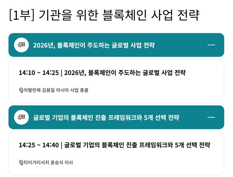 김용일 아발란체 아시아 사업 총괄이 ‘블록체인이 주도하는 글로벌 사업 전략’을 주제로 발표하고, 타이거리서치 윤승식 이사가 ‘글로벌 기업의 블록체인 진출 프레임워크와 선택 전략’을 통해 기업의 인프라 및 생태계 선택 기준을 제시할 예정이다.