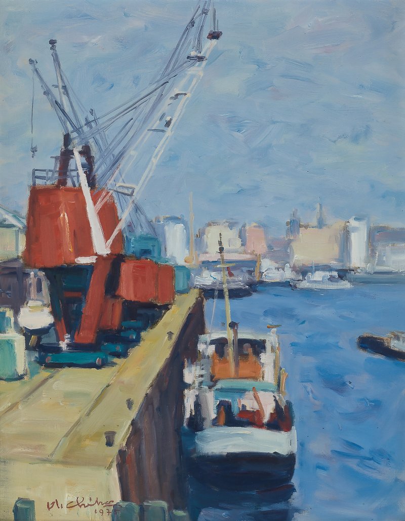 유럽 여행 직후인 1975년에 제작된 '함부르크 항 풍경'은 여행 도중 틈틈이 유럽의 항구와 전원 풍경을 스케치했던 것을 바탕으로 완성한 작품으로 오지호 특유의 투명함과 생동감이 현지의 무거운 대기를 밀어내어 밝고 다채로운 색채로 가득하다.