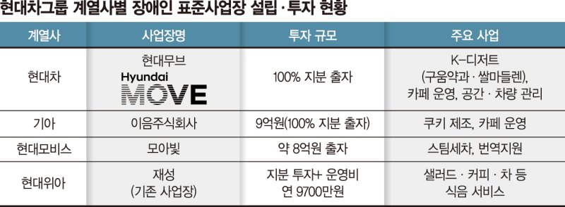 그룹 계열사 전반으로도 관련 움직임이 확산되고 있다. 기아는 지난해 6월 그룹 계열사 중 처음으로 9억원을 출자해 자회사형 장애인 표준사업장 '이음주식회사'를 설립해 쿠키 제조와 카페 운영을 시작했다.