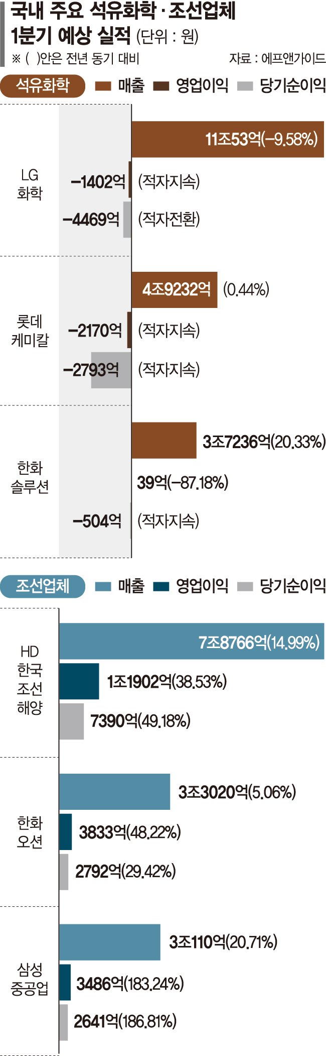 6일 금융정보업체 에프앤가이드에 따르면 LG화학은 올해 1·4분기 1402억원의 영업손실을 기록할 것으로 추정된다. 전년 동기 4470억원의 영업이익에서 적자로 돌아서는 것이다. 롯데케미칼도 2170억원 수준의 영업손실이 예상되며, 한화솔루션도 영업이익이 전년 대비 87.2% 감소한 39억원에 그칠 것으로 전망된다.